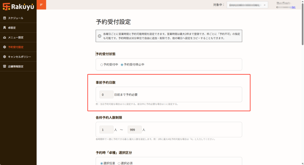 | 0日 | 当日の予約が可能になります(予約画面に当日が表示されます) | 居酒屋、カフェなど当日予約を受けたい店舗におすすめ |