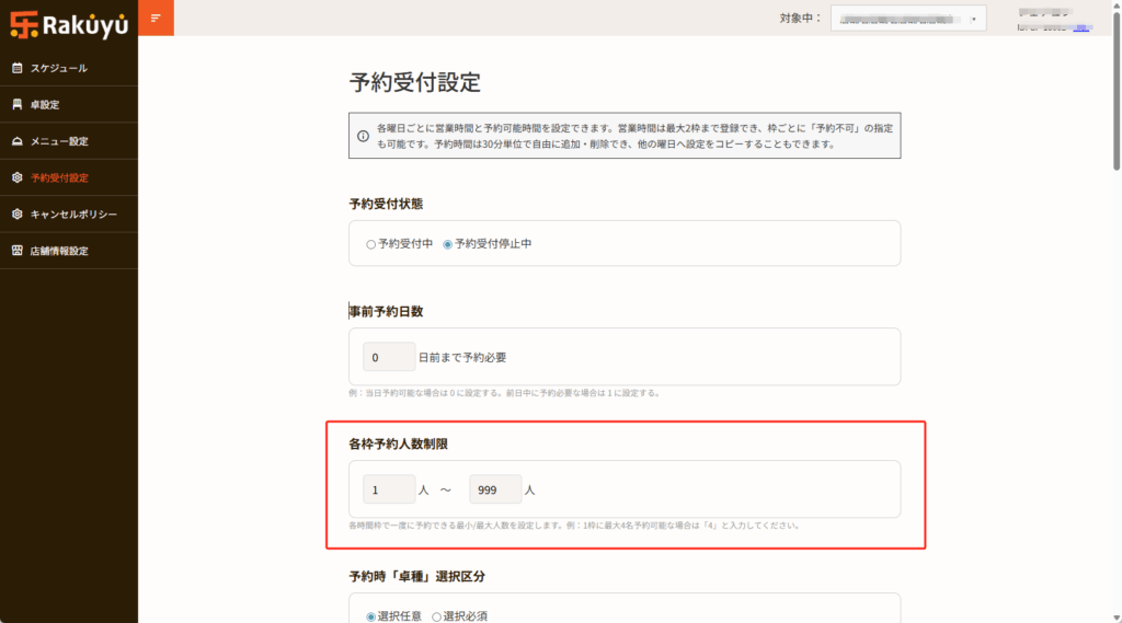 - 人数制限は時間帯やコースごとに分けて設定することはできません。全ての予約時間に共通で適用されます。