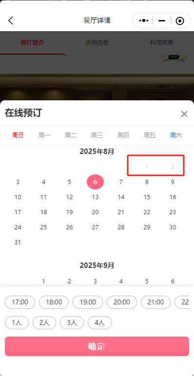 ※ 「事前予約日数」を 2日 に設定した場合の予約カレンダー画面の例です。