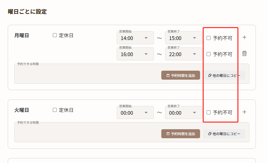 ⚠ 一時的に予約を止めたいだけの場合は、「営業時間」や「定休日」の設定で対応する方が推奨されます。以下のように、すべての時間枠に「予約不可」をチェックすることで、その曜日を営業はしているが予約不可という状態にできます。